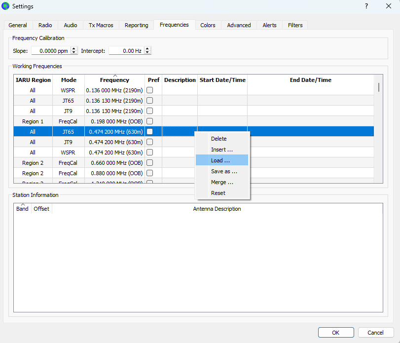 Un fois que le logiciel tourne, rendez vous dans File > Settings > Frequencies, clic droit dans la liste des fréquences et choisissez « Load ». Sélectionnez ensuite le fichier ft2-bands.qrg .